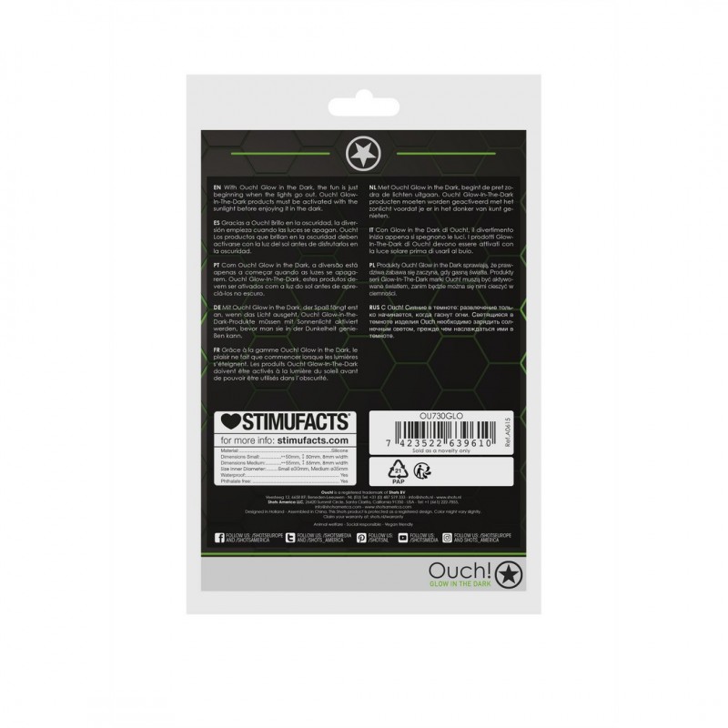 Com Ouch! Glow in the Dark, a diversão está apenas a começar quando as luzes se apagam. Este conjunto de anéis para o pénis contém dois tamanhos de anéis que são confortáveis e elásticos.