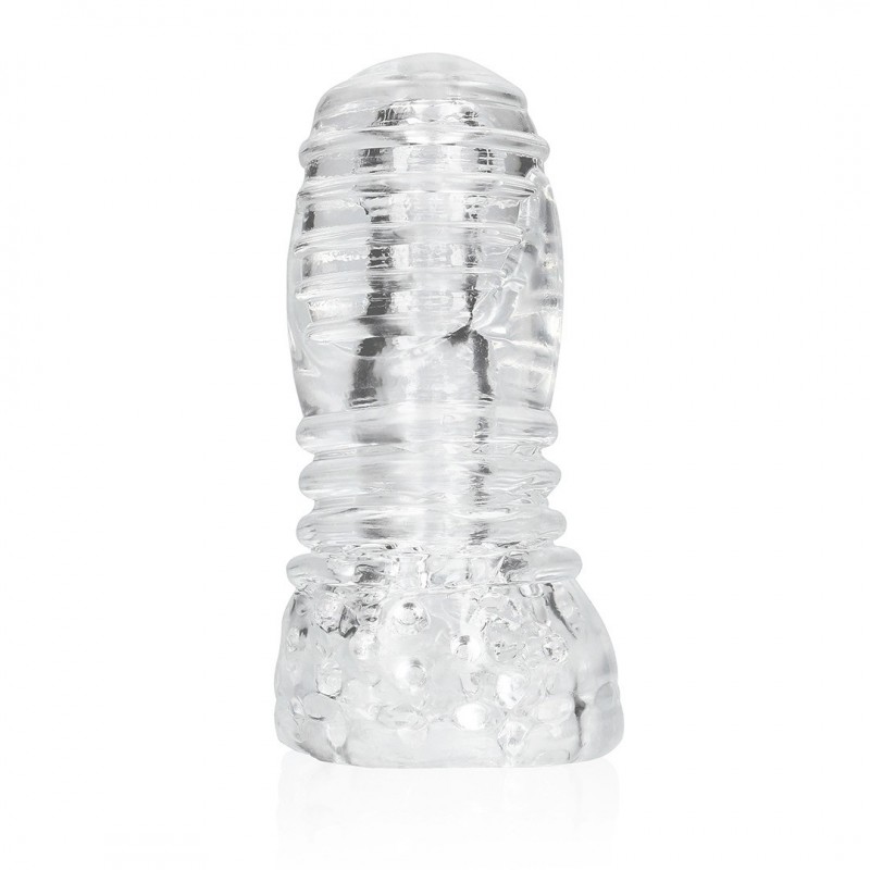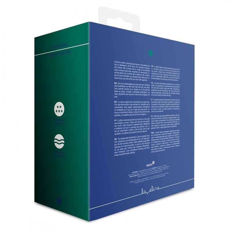 Inclui um masturbador extensível, uma correia para testículos, um anel para o pénis ajustável e um pequeno plug anal em forma de lágrima.