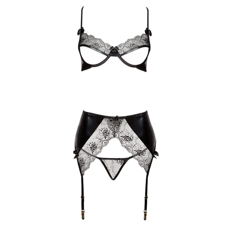 Conjunto de três peças extremamente sexy e ao mesmo tempo sensual. Feito de material lacado flexível e belas rendas. O conjunto é composto por um sutiã aberto, um cinto de ligas largo e umas cuecas sensuais.