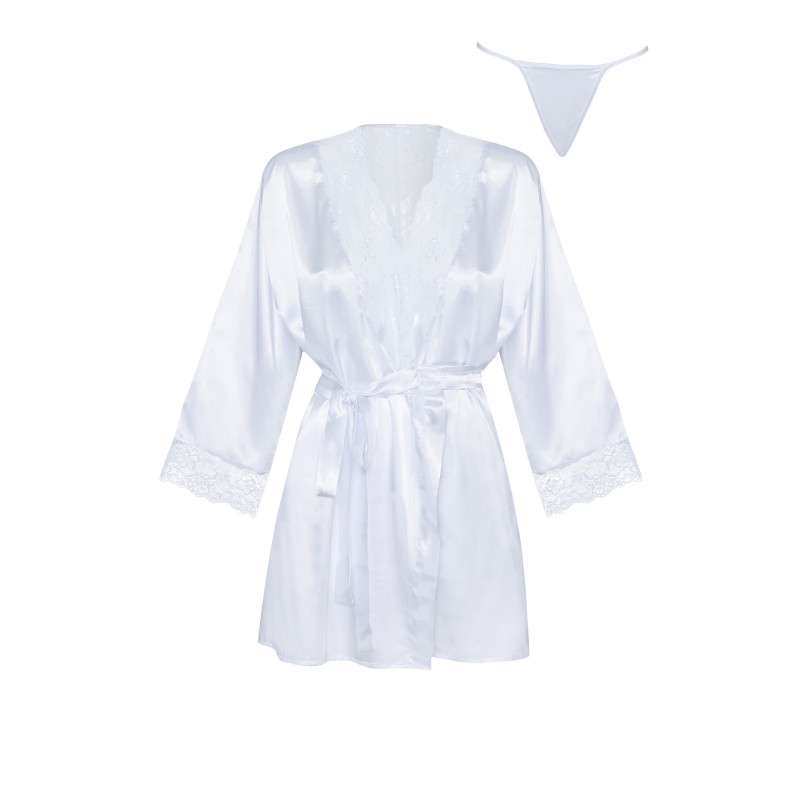 Robe elegante, confortável e sexy em branco, feito de cetim e renda. O robe tem mangas compridas rematadas por renda. Dê a si própria um toque de luxo!