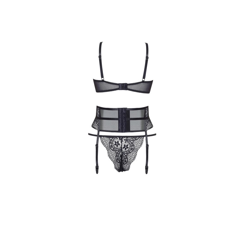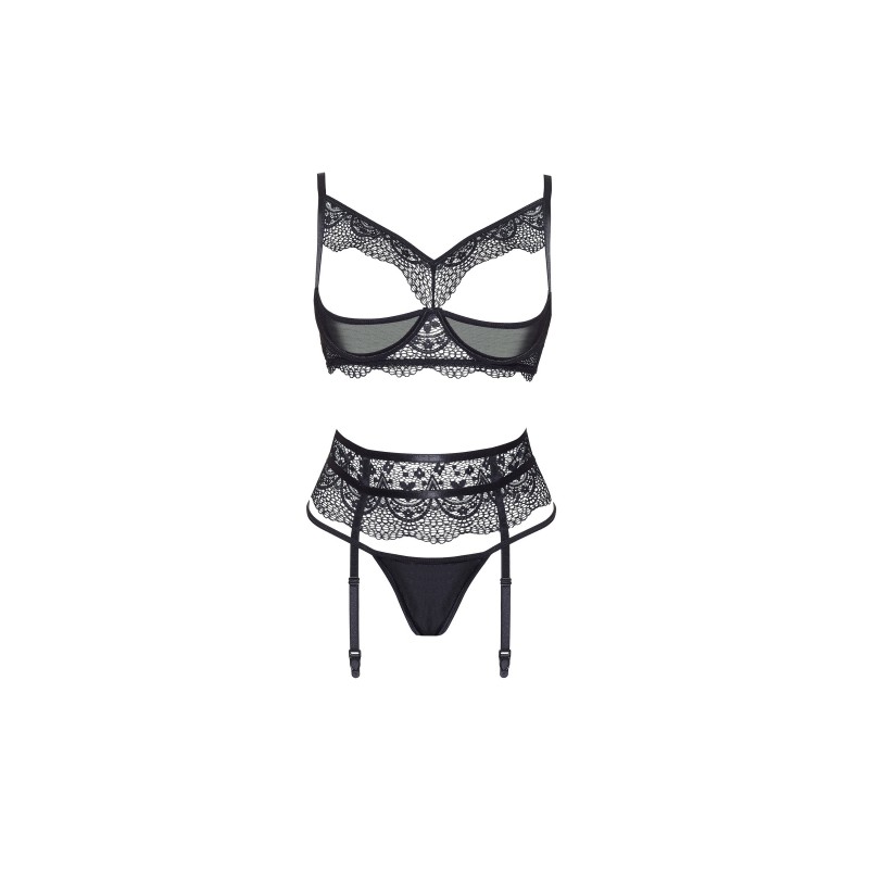 Conjunto de roupa interior preta de três peças clássico, mas ao mesmo tempo muito sexy. Sutiã aberto em renda e tule com aros. Um cinto de ligas vistoso preso com ganchos.