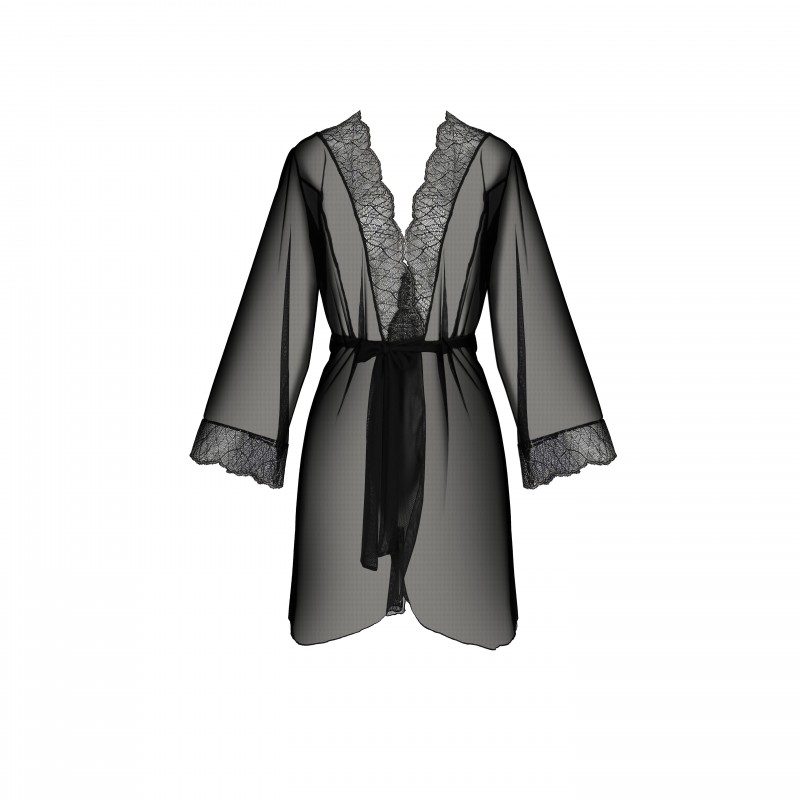Robe e tanga Amberly em tule preto com detalhes em renda fina, que conferem um visual sensual, elegante e confortável.
