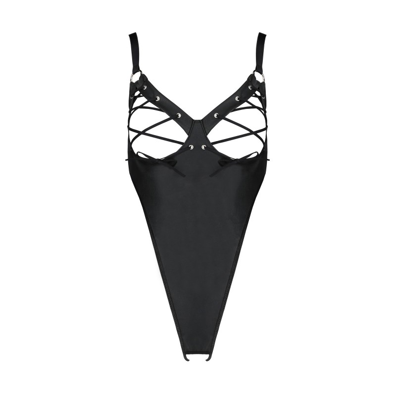 O body Celine da Passion é ousado e sofisticado, com recortes que realçam a silhueta e detalhes sensuais, como laços e anéis decorativos. É a escolha perfeita para despertar o desejo com elegância e mistério.