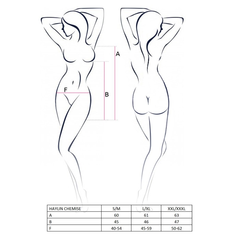 A Haylin da Passion é uma camisa de noite justa e sensual em renda, disponível em preto e cor-de-rosa, com tanga incluída e materiais que não perdem a cor nem causam alergias.