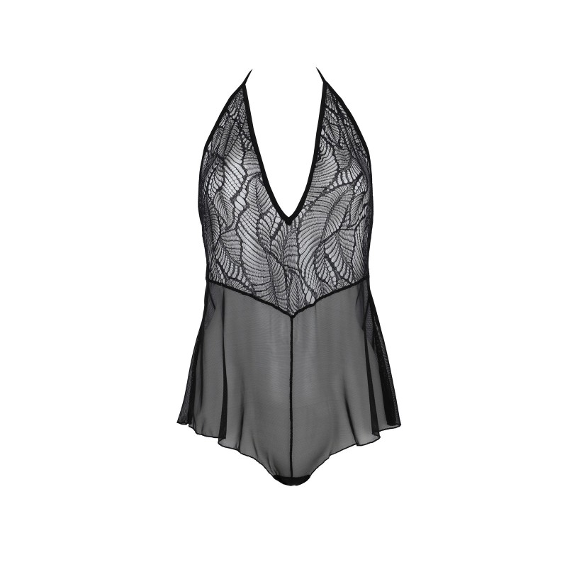 O body Leafa, em tule preto e renda, realça a silhueta feminina com elegância e sensualidade, e faz parte da coleção ecológica Passion Eco Collection.