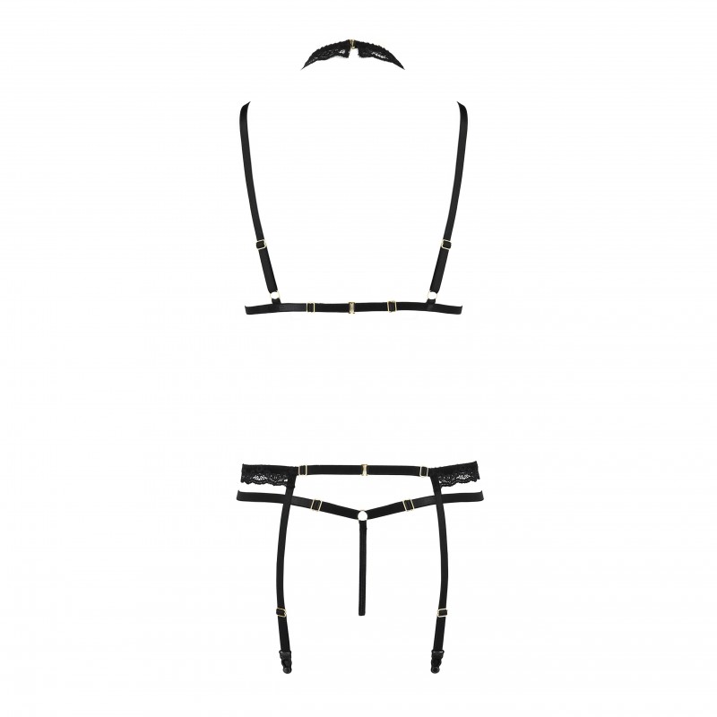 O conjunto Shelly é composto por uma gargantilha, um sutiã aberto, um cinto de ligas e uma tanga, com detalhes em renda, e é uma peça sedutora e elegante. As tiras inovadoras realçam o corpo feminino, proporcionando um ajuste personalizado e confortável.