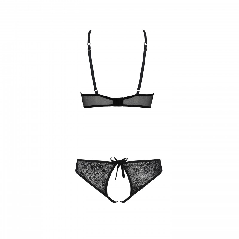 O sutiã, com copas em renda delicada, realça o decote, enquanto as alças ajustáveis garantem um ajuste perfeito e confortável. A tanga aberta entre as pernas realça as curvas femininas com detalhes em renda, conferindo um toque de sensualidade e elegância.