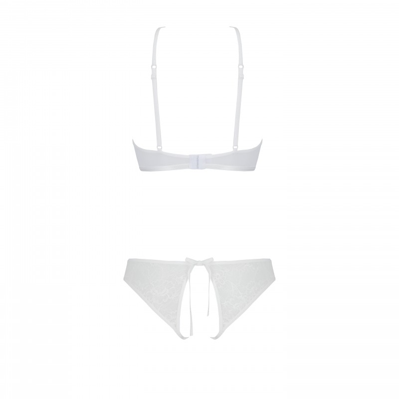 O sutiã, com copas em renda delicada, realça o decote, enquanto as alças ajustáveis garantem um ajuste perfeito e confortável. A tanga aberta entre as pernas realça as curvas femininas com detalhes em renda, conferindo um toque de sensualidade e elegância.