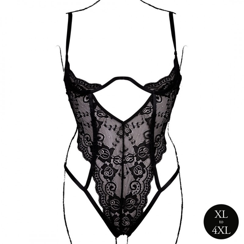 Este body de copa aberta com aros e adornado com renda, na cor preta, proporciona um ajuste sexy e confortável.