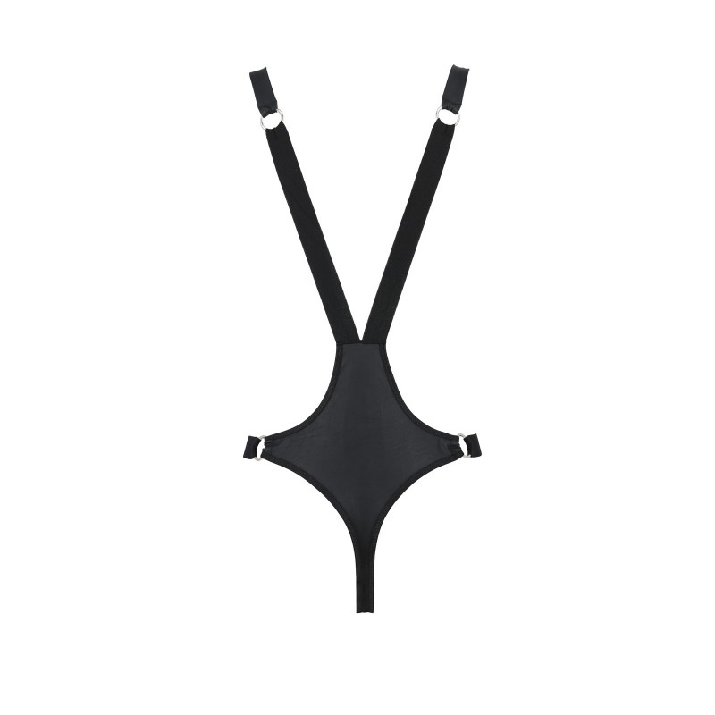 Escolha o body Harry feito de couro ecológico preto. Suspensórios confortáveis em elástico, uma tanga sedutora que expõe as suas nádegas e um acabamento rebitado tornam este body ousado e confortável ao mesmo tempo.