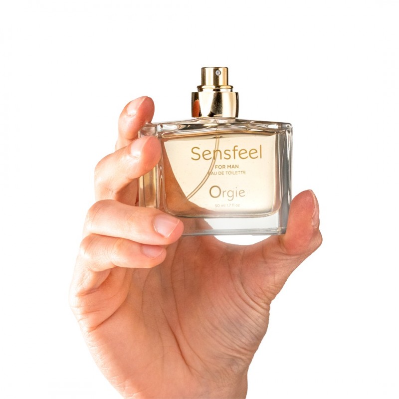 Perfume EDT Sensfeel for Man, tamanho normal de 50 ml, fórmula exclusiva da Orgie com o ingrediente ativo de base natural Sensfeel for Him™, um potenciador de feromonas que pode aumentar a atratividade dos homens através da ação simultânea de dois dos seus componentes: Forskolin, que aumenta a expressão da enzima 3 beta-HSD, que aumenta a produção do feromona sexual masculino - androstadienona, e teaflavinas, que diminuem a atividade da enzima 5-alfa redutase, diminuindo o metabolismo da androstadienona, resultando na sua acumulação.